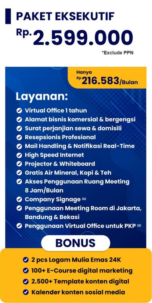 Solusi bisnis profesional dengan alamat prestisius, layanan resepsionis, serta fasilitas eksklusif untuk meningkatkan citra dan kepercayaan klien Anda