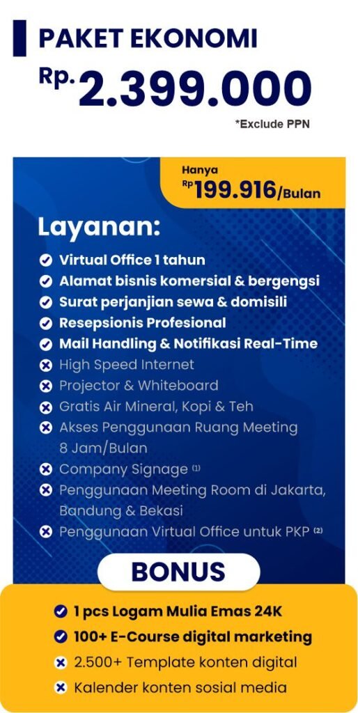 Dapatkan layanan Virtual Office dengan harga terjangkau tanpa mengorbankan kualitas! Nikmati fasilitas lengkap untuk mendukung bisnis Anda dengan biaya yang efisien